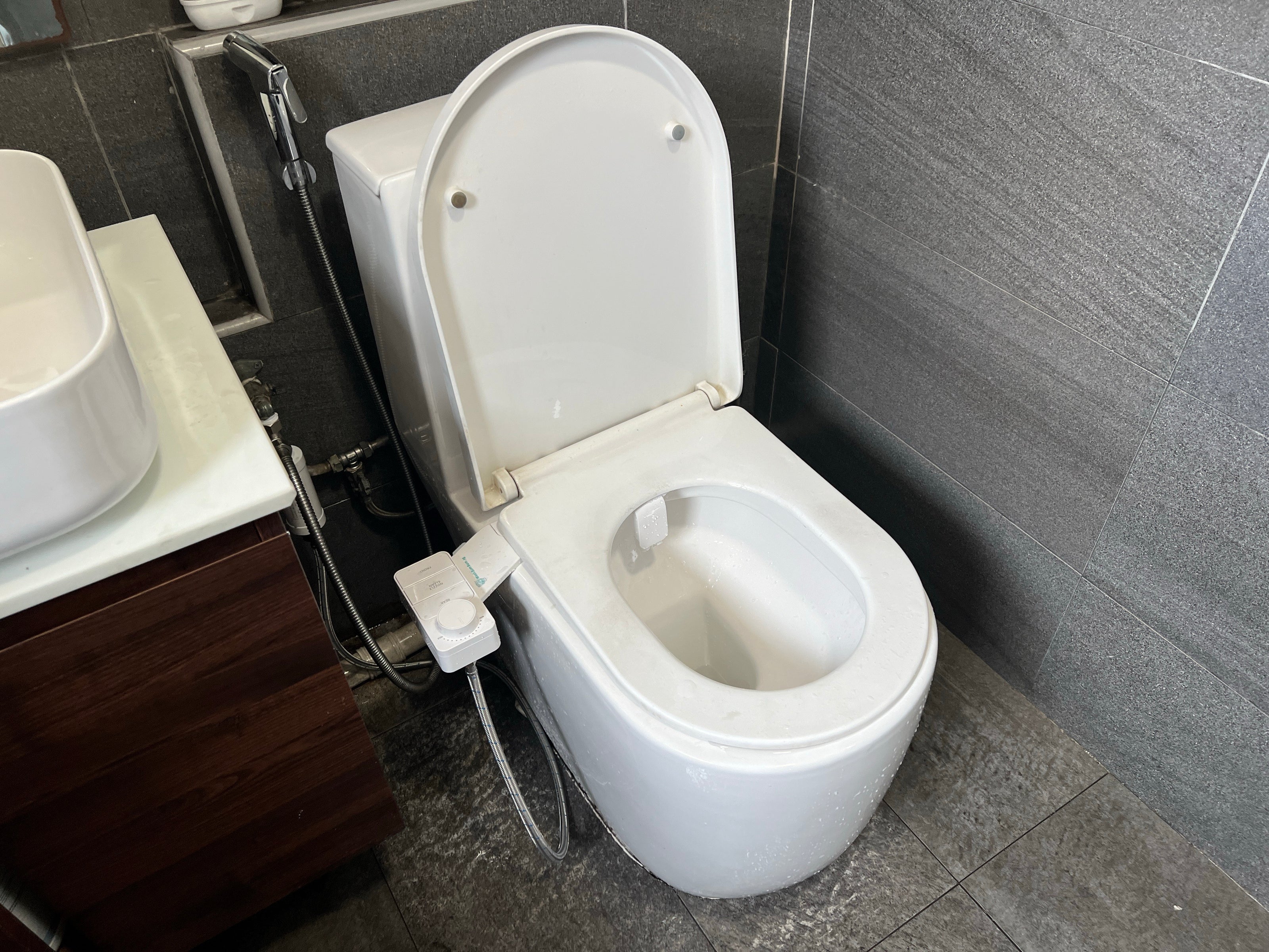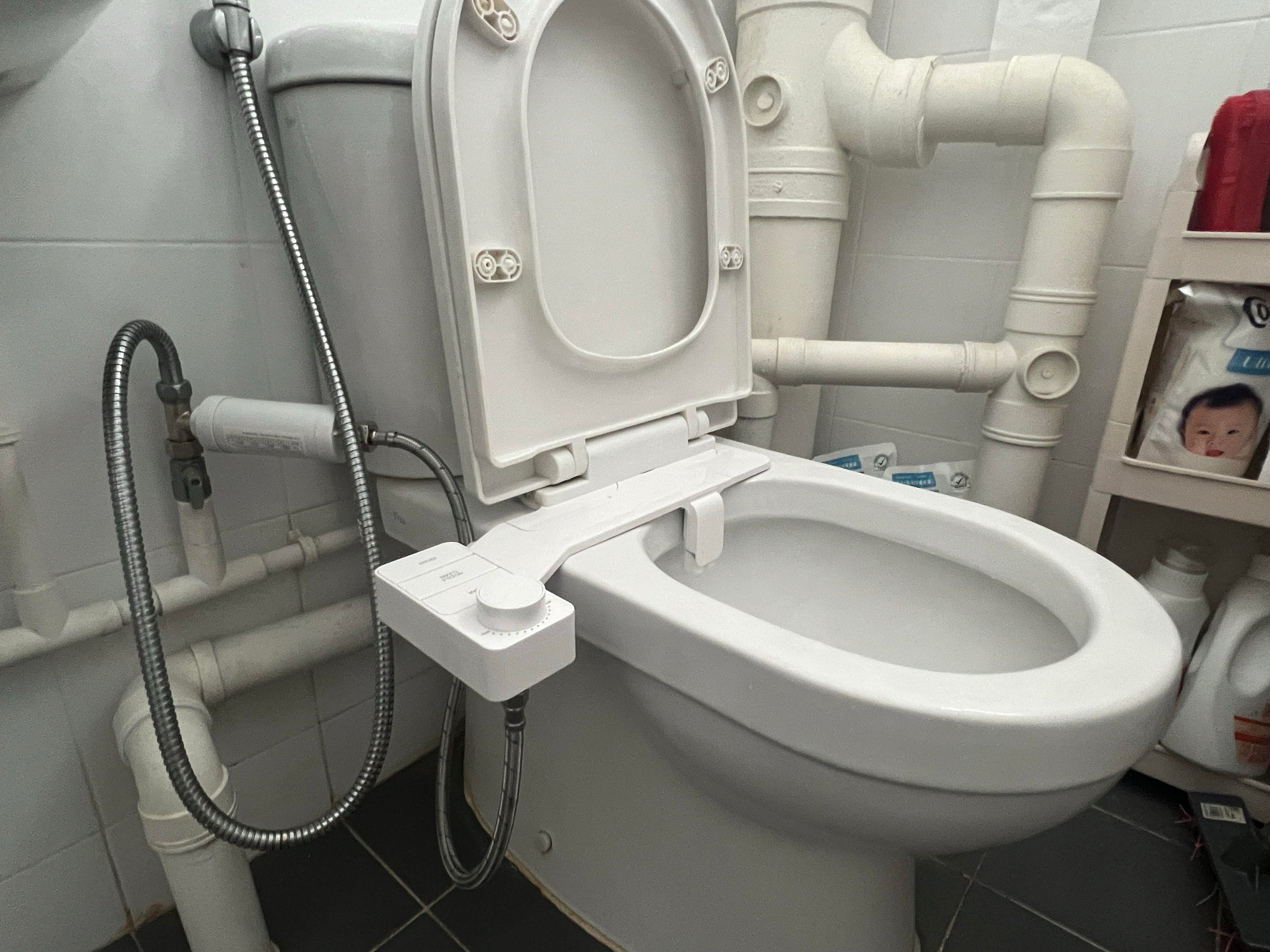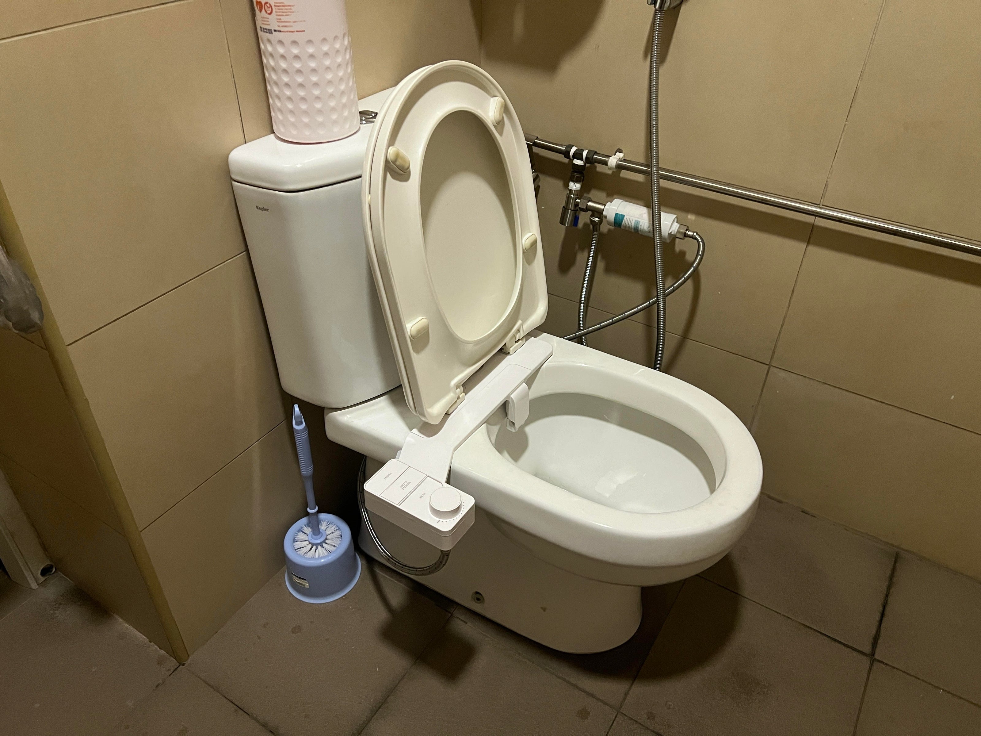 common toilet with a bidet spray and now with an additional non-electric bidet toilet seat attachment 😍